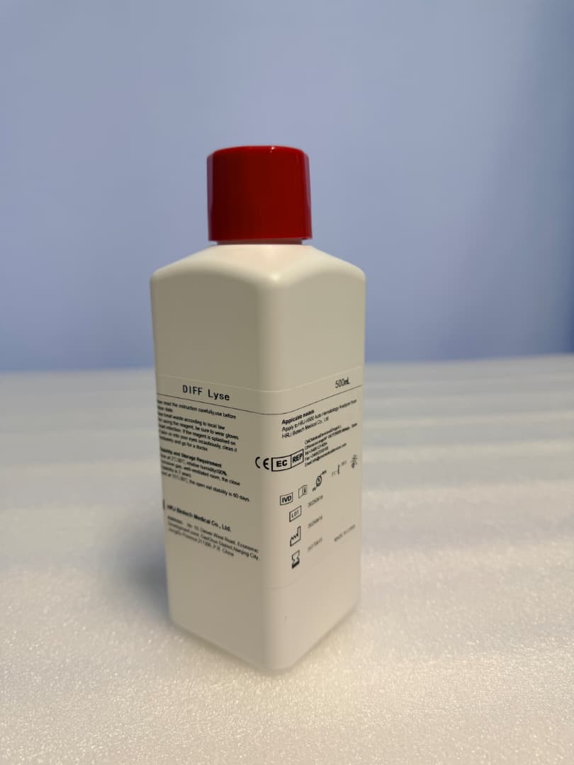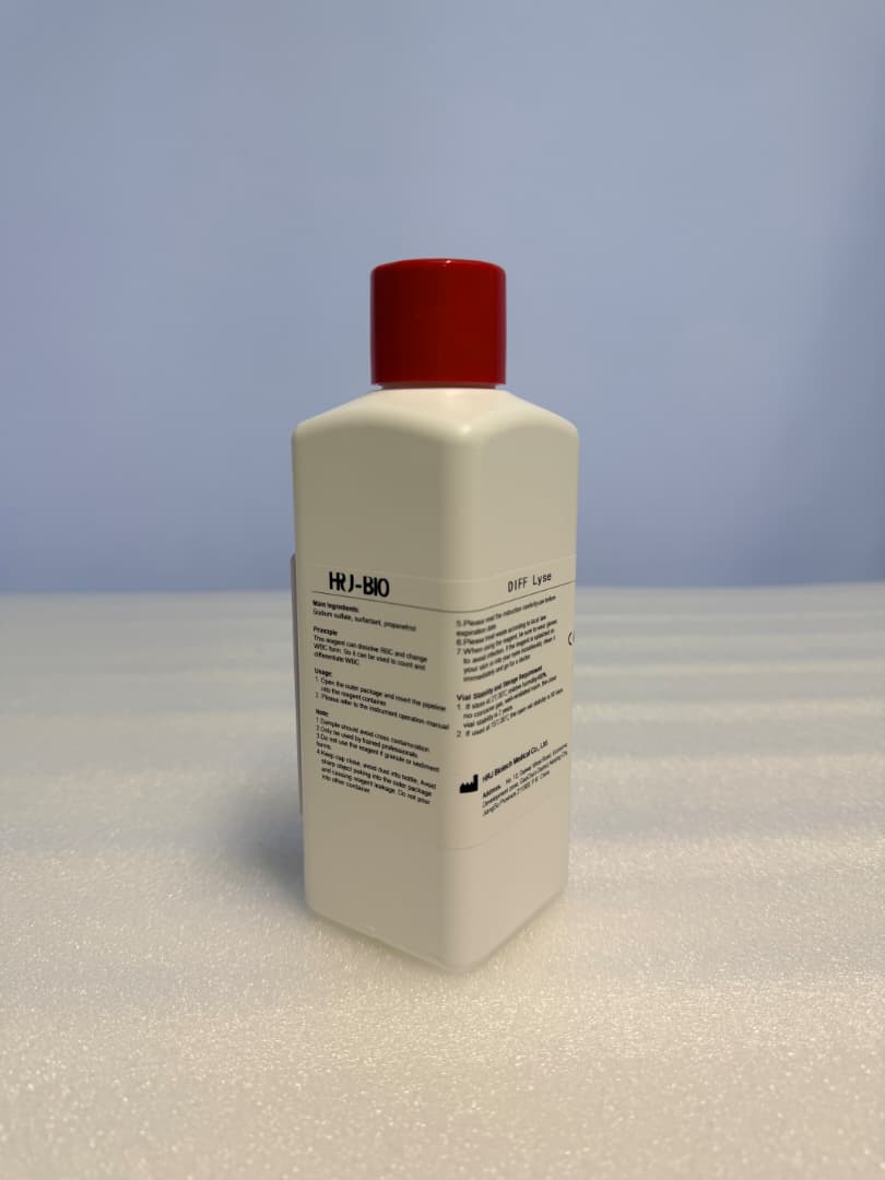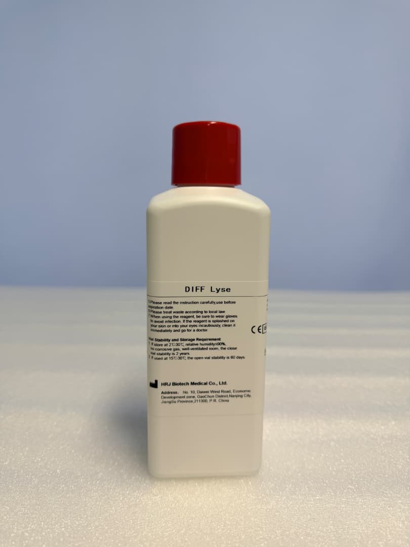 HRJ-H500 5-Part/ HRJ-H750 6-Part DIFF Lyse is a cyanide-free reagent used to lyse red blood cells and maintain the morphology of cells before blood cell analysis to facilitate the counting of white blood cells in the HRJ-H500 and HRJ-H750 hematology analyzers.