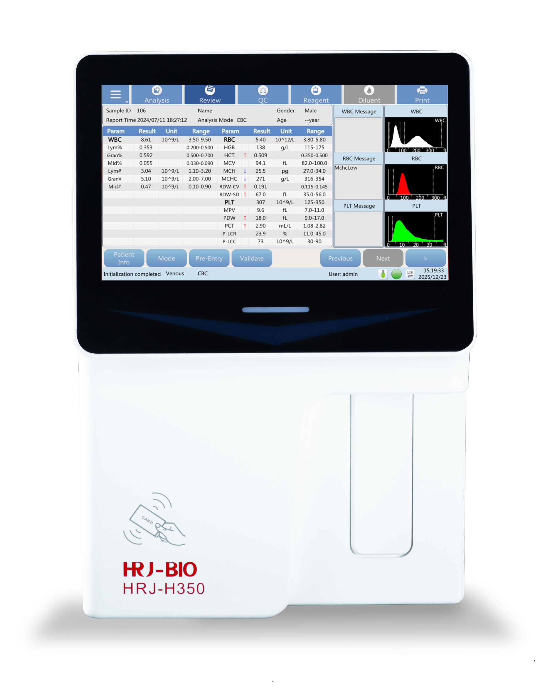 HRJ-H350 adopts impedance method for WBC, RBC and PLT tests, Cyanide free colorimetry for HGB test.